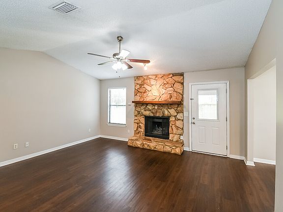 Attractive 3 bedroom, 2 bathroom home in Jacksonville, FL boasts a vaulted ceiling, a fireplace, an eat-in kitchen with white cabinets and generously sized bedrooms. You will love the huge backyard which includes a covered patio and a fence for added privacy.