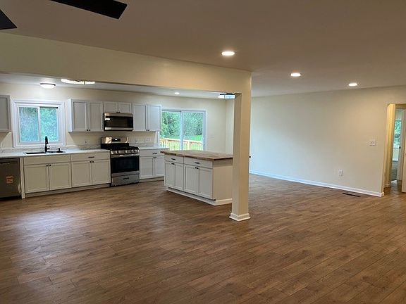 The chef’s kitchen is a show-stopping centerpiece, featuring stainless steel appliances, a gas range, exquisite cabinetry, and stunning countertops. Sliding glass doors open to a generous deck, perfect for entertaining under the sky or savoring peaceful evenings overlooking the property.