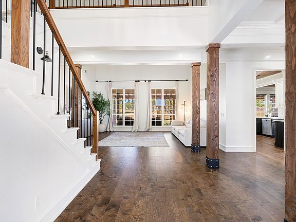 Inviting entryLight filled roomsHand scraped hardwood floorsThree car garageCovered patioCovered porte cochereVaulted ceilings