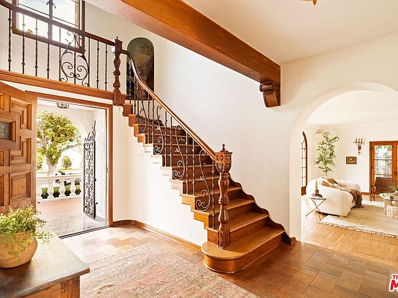 Architectural, Emotional, Character 1931 Spanish Estate by Renowned Architect George Riddle, set high above the street on a sprawling .38 acres in the heart of the prestigious Chateau Thierry neighborhood of Bixby Knolls. Striking Santa Barbara architecture with arched windows, character cornerstones, original stained glass and ironwork create incredible curb appeal. Formal foyer loaded with character and charm. Step down living room with inlaid hardwood floors, built-in shelves, fireplace, and doors to outside, opens to sun drenched sitting room that looks out to and opens to the beautiful gardens. Formal wood paneled office with built in cabinets with glass doors. Dining room with wood paneled ceiling goes out to yard and is right off the kitchen. New remodeled kitchen goes out to and overlooks yard and has huge center island with bar seating, built-in breakfast nook, double sinks + dishwashers + ovens, large fridge/freezer, pizza oven!!! Bedroom and bathroom downstairs. 3 beds + 2 baths upstairs. Primary bedroom is ensuite with an ornate and beautiful bath + shower with glass shower door. Bonus office in master suite is surrounded by windows overlooking the yard. 2 additional beds upstairs share a retro pink bath with combination tub and shower; one overlooks the backyard and the other has a street facing front porch. Special details include marble pad before front door, large landings in between and at the top of the stairs, original murals, stencils, moldings. Laundry room downstairs in the basement. Spectacular grounds include a covered porch outside the living room, an outdoor al fresco dining area outside the kitchen, a sprawling grass lawn with towering evergreen and lush fruit trees, a large pool with separate raised jacuzzi + lounge chairs + pool bath, vine covered pergola, and outdoor faux brick fireplace sitting area. Pool bath with full shower off pool. Full guesthouse with kitchenette, storage, bath with shower. Absolutely incredible!!!!!!