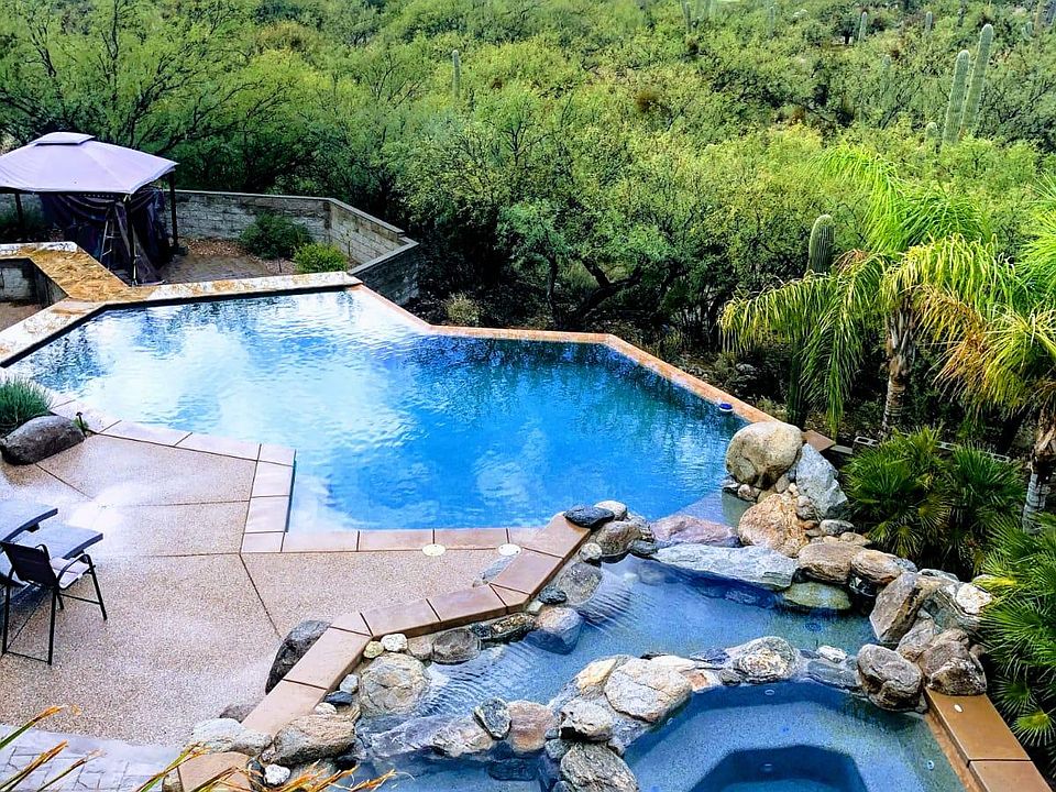Water feature spa with multiple shaded seating areas for lounging or entertaining