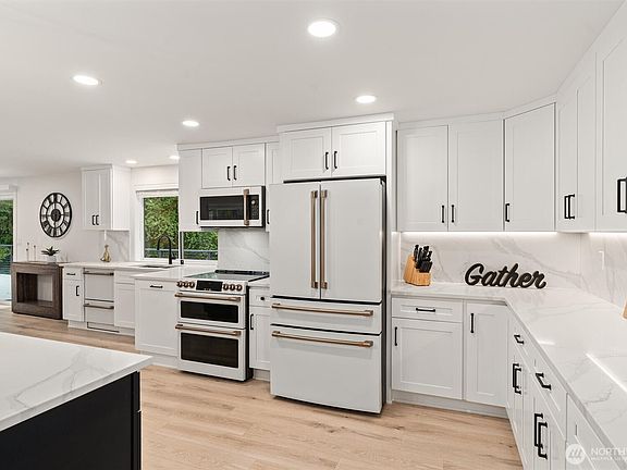 Modern luxury meets ultimate flexibility, with a little flare thrown in for good measure. Every inch of this exceptional home has been reimagined & beautifully curated to hit just the right notes. Chef's kitchen & wide open living spaces on each level will thrill the pickiest of buyers. Hidden door leads to a secret room with cool speak-easy vibes for next level entertaining. GORGEOUS primary suite w/ absolutely dreamy 5 piece bath & oversized walk in closet w/automatic garment steamer. Technically 5 bedrooms, but lives like 6. Phenomenal setup for multi-generational living, MIL, Adult Family Home (AFH), or short-term rental. Fantastic outdoor areas including a huge upper level deck & lower patio, fire pit, and expansive lawn & gardens.