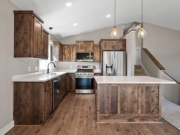 Better than new construction opportunity! This home has all the farmhouse inspired finishes everyone is looking for. Be greeted by a large three car garage and eye catching white and black exterior with masonry and shake accents. A bright spacious foyer greets you and your guests, and lends plenty of space for everyone to drop their stuff. Go up a couple of steps up and you find a large vaulted family room adjoined with a open dining space, and dream center island kitchen with granite counters, stainless steel appliances, and upgraded alder wood cabinets. On the upper level you will find two more roomy bedrooms, a full bath with plenty of counter space, and laundry. There is opportunity to build equity by adding another bedroom, bathroom, and/or family room in the walkout basement. This amazing home is set on a large lot with a wooded tree line in the rear for added privacy. Enjoy all the benefits of new construction without the construction headaches and wait.