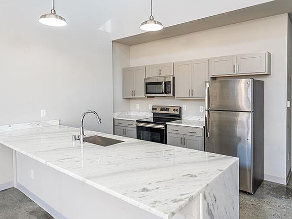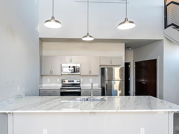 Large private patio spaceGrey white serene colorsWaterfall edgeHigh ceilingEnd unitStainless appliancesOpen floor-plan