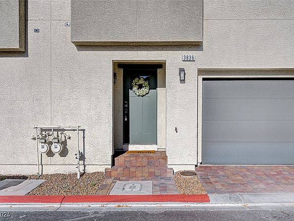 VIEWS, VIEWS, VIEWS! This modern three-story townhouse is perched above the city by the base of Lone Mountain offering sweeping views of the whole valley and the glimmering lights of the Las Vegas Strip. Located in the gated Panorama community, the home offers 3 bedrooms, 2.5 baths, a private backyard, a tandem two-car garage, and a balcony with panoramic views of the strip. It has plenty of guest parking nearby and is directly across from the community pool. The garage, (includes a Tesla charger) backyard and den are accessible from the ground floor, while the open concept second floor features the kitchen (with stainless steel appliances, quartz countertops and breakfast bar), a dining area, and a spacious open family room complete with a balcony that has park and strip views. The 3RD floor consists of the primary bedroom (with en-suite bathroom and walk-in closet), 2 additional bedrooms, full bath, and a laundry room. Furniture & decor may be negotiable as part of sale.