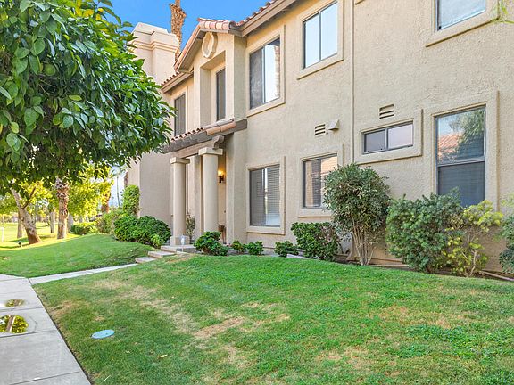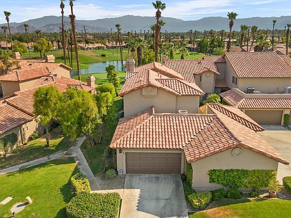 Current loan @ 3.125 to February 1, 2052 is ASSUMABLE! Spectacular views of the 15th hole of Palm Valley Country Club's Challenge Course. This partially furnished, ground level unit feels airy and open with its well designed renovations. Bright, updated kitchen with stainless steel appliances, recessed lighting and a breakfast nook. Both the living room and the primary bedroom open up onto the patio overlooking the immaculately manicured lawns, glistening water features and nearby pool. Retreat comfortably in the primary bedroom with attached bathroom that features 2 mirrored sliding-door closets and extra cabinet space for linen storage. The large walk-in shower is beautifully appointed with a neutral tone tile design, built in bench and it's all accented with dark matte-bronze fixtures. This Vista A floor plan features a built-in storage cabinet under the tv that can be converted back to a gas fireplace, laundry room and 2 car garage. Amenities: Clubhouse with dining options, fitness club, lap pool/spa, golf, tennis/pickleball and a vibrant social calendar. There are also 46 pools and spas located throughout the community. SHORT TERM RENTALS allowed for those looking to maximize their investment. Come join the ''Fun Club for ALL Ages''.
