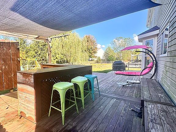 Oversized islandDeck and patioVaulted ceilingsAbundance of natural lightStainless steel appliancesGranite countertopsWhite cabinetry