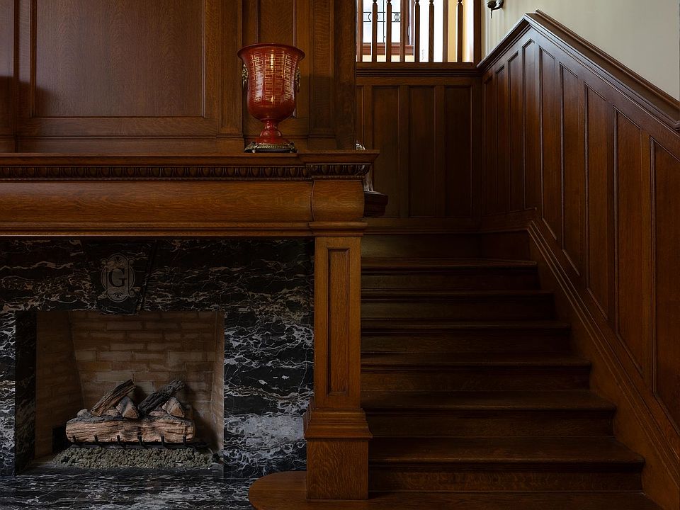 Oak floorsOak panelled elevatorStained glassTapered port cochere columns