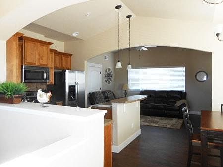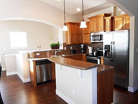 Gas fireplaceStainless appliancesGranite countertopsLarge soaker tubBright dining areaBreakfast barTile floors