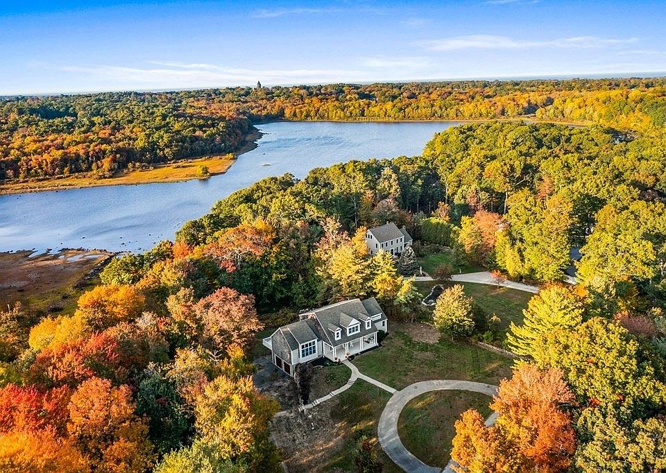 Exquisite custom home on a private lane overlooking the Scituate Reservoir. This spectacular 4,500 sq. ft. home, built in 2000 by a well-known South Shore builder, has stunning architectural detail and millwork. Perfectly sited on over 2 acres, there are scenic views from every room. The heart of the home is the designer kitchen with custom cabinetry, pantry, island, and open floor plan leading to a sun-drenched living room with cathedral ceiling, gas fireplace, built-ins, and french doors to the 40 ft deck overlooking the back yard & beyond. The light, bright floor plan continues throughout the house to the entertainment sized dining room. There is a luxurious first floor Primary Suite with walk-in closet; spa bath with vaulted ceiling; and home office. A beautiful staircase leads to the 2nd floor and two generous en suite bedrooms, each with walk-in closets and full baths. The fully finished walk out lower level with full bath provides room for extended family, or au pair. Beautiful!