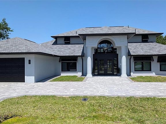 Architectural Masterpiece Awaits You. Discover an elite residence in Deep Creek, where contemporary design meets total renewal. Nestled on an expansive, private, double-sized lot at the end of a quiet cul-de-sac, this two-story haven has been completely revitalized by the current owners. The moment you approach the newly installed, massive stone paver drive—offering capacity for eleven vehicles and flanked by mature, richly wired lighted Royal Palms for the perfect ambiance you will recognize next level distinction. Step inside and be greeted by striking 18-ft ceilings and a breathtaking, open glass steel staircase—a centerpiece that defines the home's contemporary feel. Daylight streams through the tinted, impact-resistant windows, creating a warm glow across the main living areas. The entire interior has received a flawless update, including a complete repaint, plush carpeting, interior doors, and custom, designer-selected light fixtures. Unwind or entertain flawlessly in the opulent great room, featuring elegant plantation shutters and a welcoming wood-burning hearth. The residence offers five total sleeping quarters and four full bathrooms, A dedicated bathroom located near a swimming pool, allows you and guests to rinse off and change without entering the main living areas of the home an added convenience. The state of the art culinary domain is equipped with luxurious stone slab counters, a spacious central island, a breakfast bar, and an informal eat in nook. Appliances include a new GE range, Samsung refrigeration unit, Magic Chef chest freezer, and dishwasher, all supported by dual storage pantries. The integrated laundry/utility space includes upper cabinets, a wash basin, a new Speed Queen commercial washer and Samsung dryer. Retreat to the sumptuous owner's suite, featuring an expansive walk-in wardrobe, a spa-like bathroom with dual Moen basins and stunning freestanding soaking tub for ultimate relaxation. Outdoor life rivals a private resort: the heated saline pool and spa are framed by elegant stone tiling and contained within a freshly installed screened enclosure. De stress and decompress on the upper-level deck for spectacular, secluded views. The exterior boasts brand new cladding, fascia, soffits, and gutters, secured by a sleek aluminum fence with dual access gates. Functionality is paramount, two new Rheem climate control units, two new water heaters, an upgraded electrical panel, a robust central vacuum system, motion-activated illumination, and a keyless garage door opener. Irrigation is managed efficiently via a recently drilled well utilizing a Rain Bird system and an external lighting timer. Live the celebrated Deep Creek lifestyle with unmatched satisfaction. This deed-restricted community offers a peaceful backdrop with lakes and greenbelts, and this specific home is within walking distance of the Deep Creek Golf Club, a championship Mark McCumber-designed course including the popular Creekside Tavern for dining. Beyond the golf links, enjoy being minutes from local favorites like the Deep Creek Pizzeria and Beef 'O' Brady's, with extensive shopping, restaurants, and waterfront destinations in downtown Punta Gorda with Port Charlotte just a short drive away. This property in a non-flood zone area. This exceptional home is ready for immediate occupancy. Don't miss the opportunity to own this magnificent home that just came back on market after the buyer defaulted.