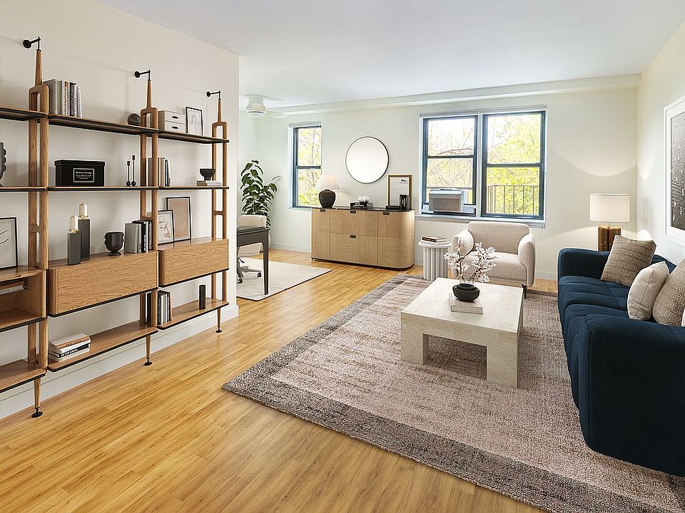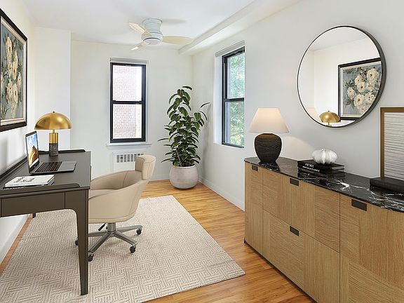 This large Junior 4, convertible 2 bedroom, 1 bath corner unit offers a welcoming and comforatable space. Upon entering the foyer, you are greeted with a very spacious living room and lots of natural light. You have the opportunity to convert the space adjacent to the kitchen into a small second bedroom, nursery or den. The renovated, windowed kitchen features lots of cabinet storage, granite countertops and a great layout. The main bedroom can easily accommodate a king size bed and more. The bathroom was also updated and has a charming floor tile, pedestal sink and window. The unit has hardwood floors throughout.