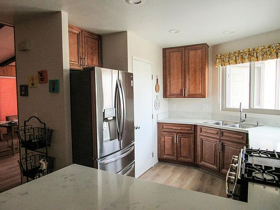 Great price on this 1800 SQ. FT. home on a 4,365 SQ. FT. lot close to the club house on a quiet street. The kitchen has been remodeled, the windows are dual pane except the front windows that have duet coverings, and the floors have laminate flooring. The master bath has a new tub shower. The AC was installed in 2018. The roof was sealed in 2021. Parking was improved with spider legs and pavers in front. The home was painted in 2024, and a new water heater was installed in 2025. This home is on tags for possible tax savings, and the golf cart is included! Call for an appoint to preview this home.