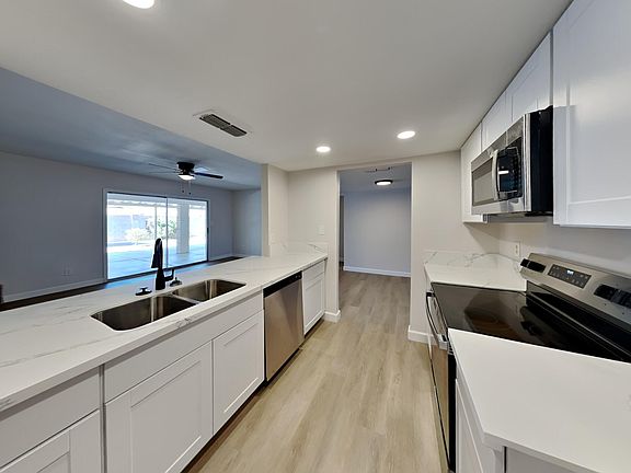 This charming three-bedroom, two-bath home boasts a host of recent upgrades for modern comfort and style. Enjoy the cool efficiency of a brand-new AC unit and the crisp, inviting look of fresh interior and exterior paint. The home features new luxury vinyl plank flooring and plush carpeting, creating a perfect blend of durability and coziness. The kitchen shines with sleek new quartz countertops and gleaming new stainless steel appliances, making it a culinary delight. Home proved covered RB parking as well as 2 car garage. This updated residence is ready to offer both beauty and functionality for its new owners.