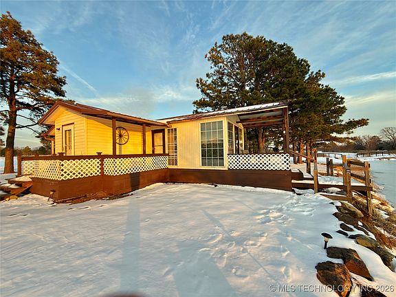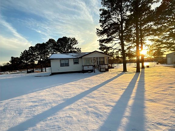 Make this beautiful bungalow-style home situated on 12 scenic acres with a stunning private lake setting your own. Enjoy lakefront living without leaving home—simply step out the back door or relax in the sunroom or one of the covered porches overlooking the water. The property is fully fenced, primarily with field wire suitable for goats or other livestock. Utilities include rural water, East Central Electric, and access to EcoLink high-speed fiber optic internet. This all-electric home features a durable metal roof, a sunroom, and three covered porches. The stocked lake offers excellent fishing, and the rear of the property includes mature trees and a designated hunting area. A detached garage/shop includes living quarters, ideal for guests or extended family.