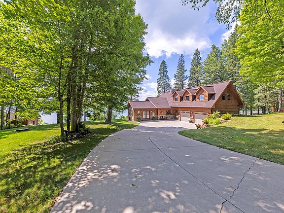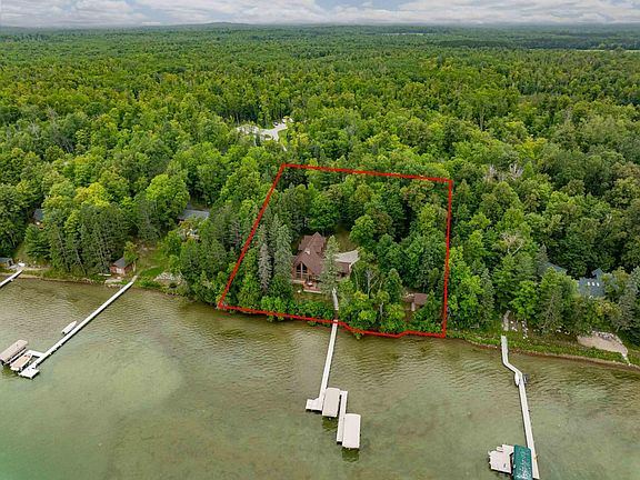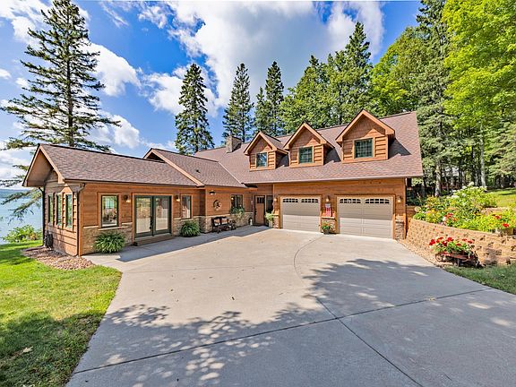 Every so often, a property comes available that truly stands out. This Sugar Lake retreat offers southern exposure, superior craftsmanship and design, incredible views, and 200’ of perfect sugar sand waterfront. The main residence features 3 bedrooms, 2 stall heated attached garage, a soaring great room anchored by a stunning floor-to-ceiling fireplace, a cozy loft with second fireplace, and a four-season porch bathed in natural light. Step outside to a brand-new deck and thoughtfully designed landscaping that frame breathtaking views of the aquamarine waters of Sugar Lake complete with a charming and functional “boathouse” at the water’s edge. Complementing the home, the detached 3-stall heated garage is a true extension of the estate. Finished with durable poly floors and carefully detailed interiors, it includes bathrooms and an impressive upper-level bunkhouse. The upstairs living quarters are beautifully finished—spacious, comfortable, and designed with the same craftsmanship as the main home, making it ideal for hosting guests, creating a private retreat, or accommodating gatherings by the lake. All this, and championship golf and restaurants available at Sugar Lake Lodge less than a mile away. This is the lakefront living at its finest!