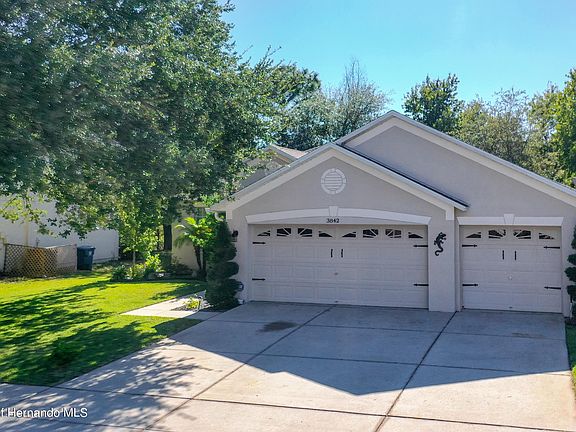 This charming 4 bedroom, 2 bath, 3 car garage home is located in the desirable gated Sterling Hill Community. As you approach, you will be greeted with a beautiful, landscaped front yard with botanical garden style flowers beds and a koi pond with fish. The stunning, new handmade front door opens into a lovely open floor plan where you will step into the comfy and inviting living room which includes the fireplace and TV has triple sliders leading to the lanai. Formal dining room makes a great option for an office or a playroom. The kitchen offers ample space to prepare your favorite meals and features beautiful tile backsplash, new sink, garbage disposal and a closet pantry. The roomy eat-in area has double sliders that lead to the lanai. The spacious master bedroom features a HUGE walk-in closet. The updated master bath features a tile shower and a separate garden tub. The 3 other bedrooms are roomy in size with one of them used as a game/media room. The media shelves are included. There is a dedicated laundry room which includes the washer and dryer. The 3 sets of sliders lead outback where you can relax & enjoy the beauty and serenity either in your screen enclosed lanai or step out to the newly added open patio with pavers and enjoy your morning coffee with no rear neighbors. Other amazing features include BRAND NEW ROOF PRIOR TO CLOSING, AC 2018, new interior paint, workbench and some shelving in garage included, attic with lots of storage and shelves, outdoor wall hangings included, ring doorbell, gorgeous chandelier located at the front entrance, newer laminate flooring, monkey bars outback stay. The resort-style gated community provides 2 clubhouses that have a fitness center, billiards, and meeting rooms for rent, 2 pools, splash area, tennis, basketball, volleyball court, playground, dog park, and RV parking area. Nature Coast enthusiasts enjoy all our area has to offer. Veterans Memorial Park, and Anderson Snow Park, popular for its sports complex and play area are less than 5 miles away. Crews Lake Park, known for its beautiful camping sites and picturesque scenery is just 15 minutes south of us. Minutes to the famous Weeki Wachee live mermaids, our local beaches, Pine Island Park and Roger's Park for fun on the water are within 30 minutes. Close to the Suncoast parkway for quick access to the airport, Tampa, Clearwater and St. Pete Beaches (Ranked in the top 5 Beaches in the US), also close to the famous Tarpon Springs Sponge Docks. Lots of shopping and local favorite dining options.