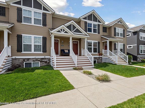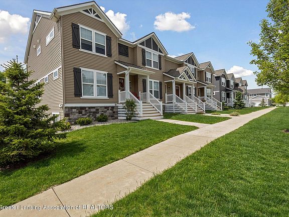 Welcome to this stunning townhome located in the highly sought-after Okemos School District! Blending comfort and connectivity, this home is ideally situated near MSU, local schools, restaurants, and with easy highway access. Featuring a spacious attached two-car garage, the property boasts high-end design and finishes throughout. On the main floor, you'll find an open-concept layout with a thoughtfully designed kitchen featuring updated appliances, a large sink, bar seating for four, and a generously sized pantry. The adjoining living and dining areas provide a perfect setting for entertaining, while a convenient half bath and additional coat closet add everyday functionality. --> Upstairs, you'll find two well-appointed bedrooms, each with generous walk-in closets and private en-suite bathrooms. The primary bedroom also features a dual-sink vanity for added comfort and style. A dedicated laundry room is located on this level adjacent to the bedrooms, along with a linen closet offering extra storage. The finished lower level includes a private bedroom with a walk-in closet and a full bathroomideal for guests, a home office, or additional living space. Just under the stairs, there's a dedicated coat closet with custom shoe shelving and extra hanging space for convenient storage. Enjoy outdoor living with a private deck and a covered front porch, ideal for relaxing or hosting guests. This well-maintained home is move-in ready and benefits from HOA amenities and services, offering peace of mind and a beautifully kept community. Room measurements are estimates per board requirements. Schedule your private showing todaythis exceptional townhome won't last long!