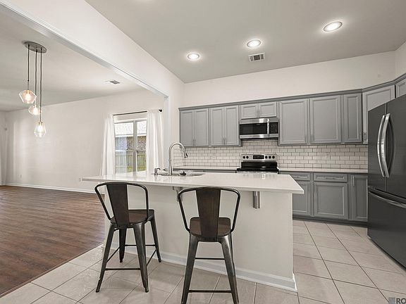 This two-story, 4-bedroom, 3-bathroom home features an open floor plan that creates a spacious and inviting atmosphere throughout. It includes slab granite countertops and under-mount sinks in both the kitchen and bathrooms. The kitchen features a large island with a breakfast bar and is equipped with an energy-efficient SS Frigidaire appliance set, including a range, dishwasher, and microwave hood. Wood flooring extends through the living room, while ceramic tile is used in the wet areas. The main-level master suite offers a luxurious soaking tub, a separate glass enclosed shower, a double vanity, and a large walk-in closet. Upstairs, there is a convenient computer niche. The exterior blends brick and stucco with 30-year shingles, full sod, and seasonal landscaping. The home sits on one of the largest lots in the development with plenty of space for outdoor activities. Hidden Farms is a peaceful neighborhood tucked away at the end of Brown Rd, just two minutes from Oak Grove Primary School. The location offers a perfect balance—close to Baton Rouge’s amenities while providing a quiet, country lifestyle less than a mile from the parish line. Ask your lender about ONE HUNDRED PERCENT (100%) FINANCING through USDA RD Loan Programs. Call for your private tour today!
