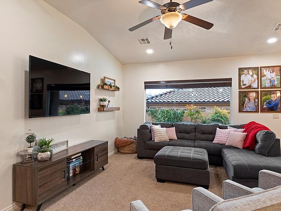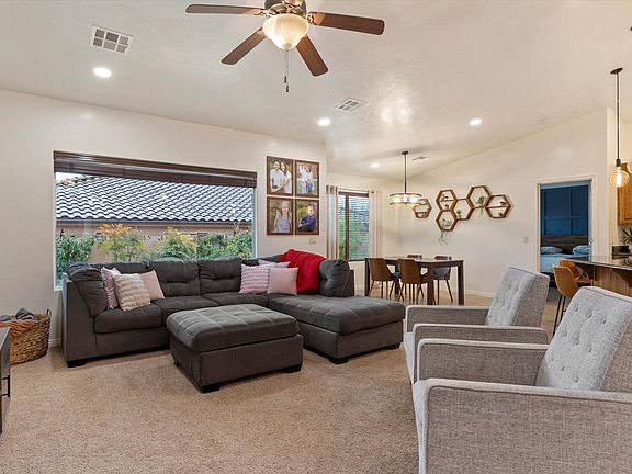 Beautiful and well-maintained home, centrally located nearby to the HOA community pool, Harmons, Tuacahn, Archie H Gubler park, Snow Canyon State Park, and More! Enjoy the tall and inviting entry way opening vaulted ceilings, a spacious open floor plan, tile floors, large kitchen pantry, and beautiful master suite with a double vanity, soaker tub, and his & her walk in closets! Updated with two new accent walls and new paint throughout, done just a few months ago! This home offers a large, covered patio, and pomegranate trees included in this mature landscape with many blooming plants you'll enjoy this Spring! Fiber internet is available, the sellers currently use Century Link quantum fiber. Buyer to verify all information, deemed reliable, however buyer to verify all info including utilities & HOA information if applicable. The listing Broker's offer of compensation is made only to participants of the MLS where the listing is filed.