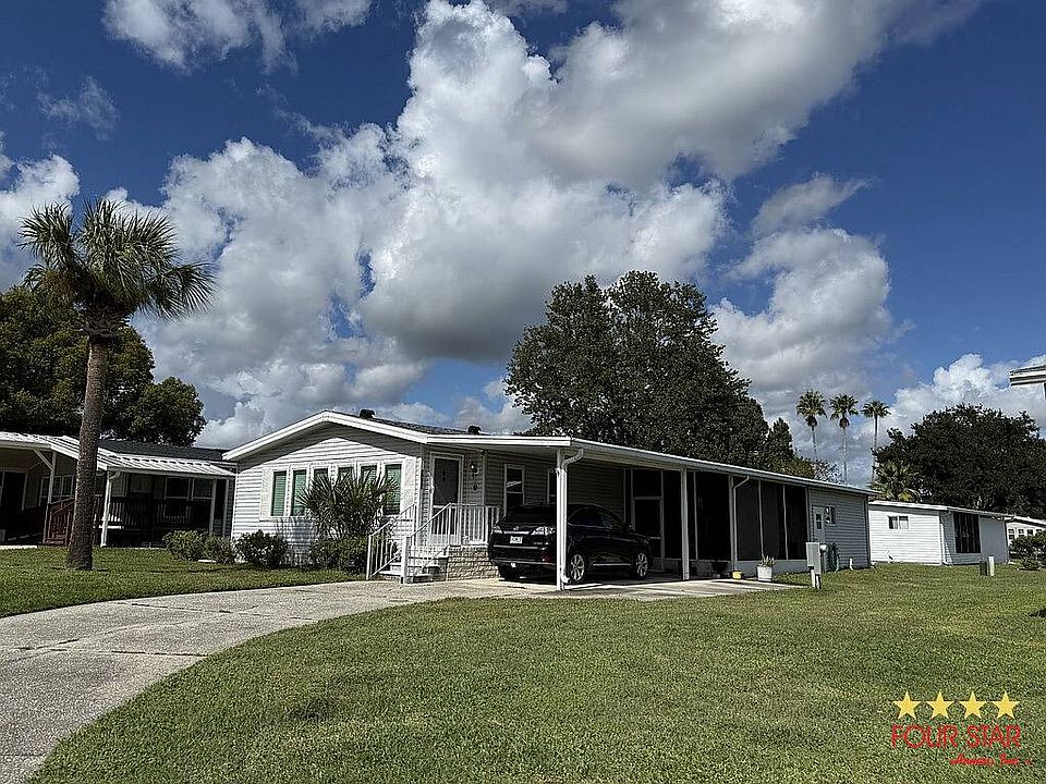 This charming manufactured home presents a wonderful opportunity for someone looking to personalize a spacious residence in a welcoming and active 55 plus community. With a generous total of 1464 square feet, this home features two comfortable bedrooms, two full bathrooms, and a large bonus room at the front of the home that can be adapted to suit your lifestyle. Nestled in a quiet cul de sac, it offers added privacy and a relaxed atmosphere while still being close to community amenities. The major components of the home are in excellent shape, providing a strong foundation for future updates. The roof was replaced in 2020, the HVAC system was updated in 2017, and the home is equipped with new energy efficient windows installed in 2022. Inside, a dedicated laundry room offers added convenience and functionality. A screened porch invites peaceful outdoor enjoyment, while the oversized storage room with loft space provides plenty of room for hobbies and seasonal items. Although the home could benefit from some finishing touches and personal upgrades, it is priced to sell quickly and offers outstanding potential for its next owner. With solid structural updates already completed, transforming this residence into the perfect Florida retreat can be both achievable and rewarding. This is a great chance to invest in a home where comfort, convenience, and community come together.