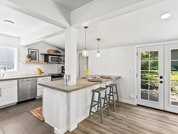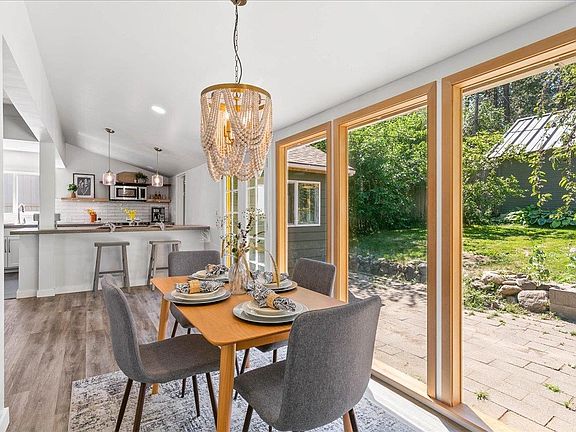 Beautifully remodeled South Hill bungalow! Enjoy incredible panoramic views of the surrounding mountains and city lights from your covered front porch swing. Bright and modern open floor concept highlighted by all new bay windows, new LVP flooring and carpet, contemporary style concrete countertops, subway tiled kitchen, stainless appliances, and new vinyl windows. French doors lead out to an inviting private patio and beautifully landscaped yard in a natural setting. Raised flower beds, numerous plum, cherry, and apple trees combined with mulberry, strawberry, and raspberry bushes make this property a gardener's dream. Heated garage is updated with newer metal roof and 60 amp power for all your shop projects. Other amenities include blazing fast gigabit internet service, main floor laundry, newer roof, and an outdoor children's playhouse. This home absolutely shines!
