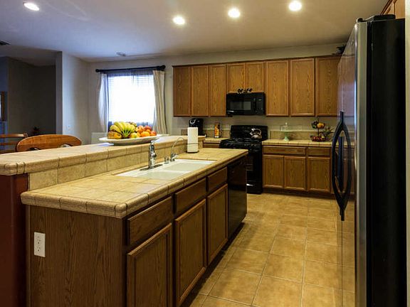 This house has a lovely open floor plan with custom paint throughout. The kitchen is a chef's dream with medium oak cabinets, black appliances and upgraded tile countertops, breakfast bar and a place for the family dining table. The master bedroom has high ceilings with a ceiling fan, walk in closet, attached en suite with garden tub, walk in shower and double sinks. One of the other bedrooms is very large also. Tile floors throughout with nice carpeting in the bedrooms. High ceilings and wide hallways throughout the home. There is a large family room with a wood/gas fireplace with tile surround. Wonderful covered patio with ceiling fans and entertaining space in the back yard. This home is centrally located and not far from the freeway for an easy commute. You will love this home.