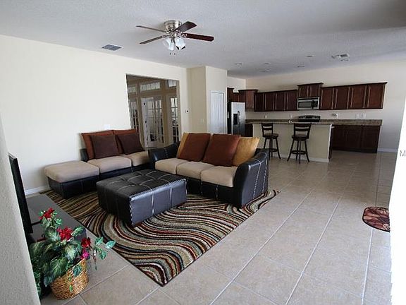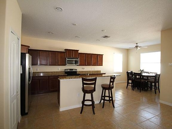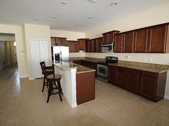 This beautiful 4/3/3 energy efficient home features a formal living room OR dining room AND elegant french doors that open up to a spacious den, with 18X18 ceramic floor tiles throughout all main living areas and carpet in the bedrooms. The updated kitchen, which opens up to the family room, offers plenty of counter space, featuring a center island, with granite counter tops and stainless steel appliances, and a separate eating area. The spacious Master bedroom suite offers large walk in closets and a luxurious master bath with a huge oval garden tub and a separate glass enclosed shower stall, and double sinks. The split bedroom floor plan allows for additional privacy for all in the home. This home features easy access to major arteries for easy commute and has zoned schools nearby. Enjoy the Jr. Olympic Swimming pool and other community amenities, such as the tot lot playground, basketball and tennis courts, indoor billiards, and over 5,000 square feet of clubhouse space with a 14 machine fitness center! Purchase this well-kept home, almost new home, for less than you would pay for new construction! Come and make this home yours today!