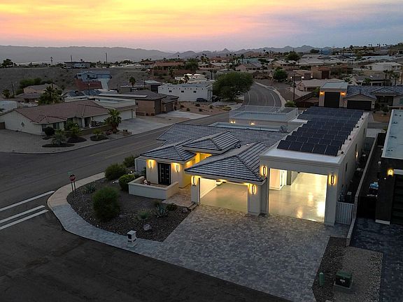 DOUBLE 96 ft TRUE DRIVE THROUGH GARAGE SPACE! Easy to maneuver w/ dual street access. One of Havasu's Most Unique Compounds. All the desired amenities coupled w/ Extreme Luxury in one sweet package! Plus No HOA!! Special Edition 4 bed Moran built home comes w/ a separate Full Casita of true living space including kitchen, living room, laundry, bedroom & bath. Main home features impressive designer coved ceilings, crown molding & a layout built for comfort & function. Oversized kitchen offers generous storage space w/ floor to ceiling cabinets. Large master suite features a walk-in closet, dual sinks, a luxurious shower & slider leading to spa & pool. Guest bedroom w/ french doors to private patio. Custom & unique outdoor living area w/ sliders from every room leading to the pool & waterfall edge spa. Pool area is surrounded by living & garage spaces creating perfect privacy while enjoying views poolside or from roof top viewing deck where you will soak in the panoramic lake & mountain views. Massive garage is equipped w/a full bath, man cave area, air-conditioned w/ 3 mini-splits perfect for RV, boats, hot rods & all the desert toys. Just Blocks to desert trails. YES OWNED SOLAR!