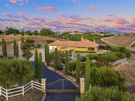 Exceptional Single-Story Wine Country Estate! Discover a truly one-of-a-kind single-story home set behind a private double-gated entrance in the heart of Temecula’s renowned wine country. Immaculate inside and out, this residence captures sweeping sunrise and sunset views across 2.74 acres of fully usable land, offering rare privacy and room to expand. Built in 2006, the home features three bedrooms and three-and-a-half bathrooms, plus an oversized three-car garage with soaring ceilings. Thoughtful upgrades include a reverse-osmosis whole-house water system, water softener, and a Generac whole-home backup generator tied directly to the electrical panel for peace of mind. The great room showcases automatic blackout blinds, a surround-sound system, and two elegant fireplaces, creating a welcoming environment for everyday living or entertaining. Outdoor amenities rival a private resort. A sparkling saltwater pool and spa overlook breathtaking sunsets, while a covered patio with a built-in barbecue kitchen and abundant seating makes entertaining effortless. A second patio features a new Alumawood cover, ideal for relaxed gatherings. The grounds boast lush, vibrant landscaping with a fully renovated sprinkler system, extensive lawn areas, and ample level space for future additions such as a vineyard, guest house, or equestrian facilities. Practical details enhance convenience and security: a newly poured asphalt driveway, a Spanish-style tile roof, and a double-gate design with automatic entry. Abundant RV and boat parking. Situated in a premier section of wine country close to both the north and south wine trails, this property combines unmatched privacy with easy access to Temecula’s celebrated wineries, dining, and events. Homes of this caliber rarely come to market. With its striking location, luxurious upgrades, and endless possibilities, this estate is truly one of a kind and will not last long.