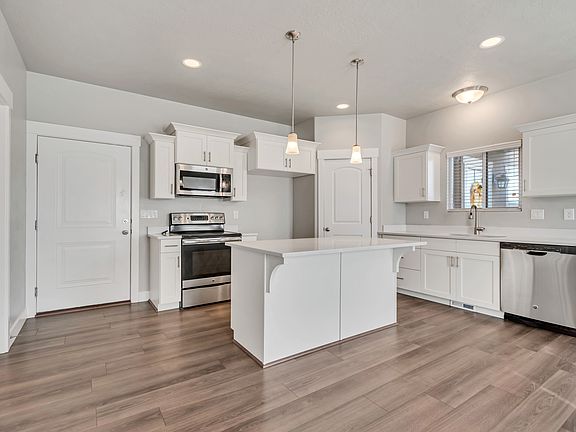 Enjoy laminate floors, an open kitchen with quartz counters, stainless steel appliances, and a large corner pantry. The master suite features a large walk-in closet, dual sinks, quartz counters, and a separate tub/shower. Includes two spacious bedrooms, an unfinished basement, and a large 2-car garage. Front door faces the Ranches Golf Course!