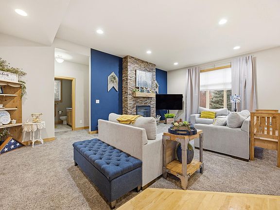 The main level features an open floor plan with a custom kitchen, dining nook, and a spacious great room highlighted by a floor-to-ceiling stone fireplace. An office with French doors, a welcoming foyer, and a convenient half bath complement the space. The primary suite includes a jet tub, walk-in closet, and easy access to the main-level laundry. Two additional bedrooms and a full bathroom complete this level.