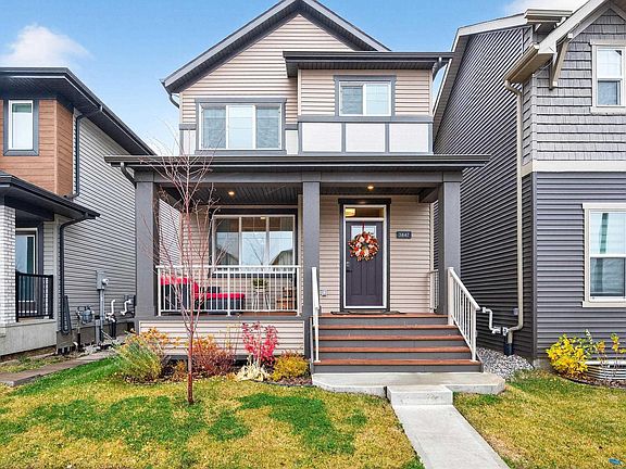 Step inside this beautiful, meticulously maintained 2-storey featuring stunning herringbone vinyl plank flooring & a stylish, open-concept main floor. The inviting layout includes a cozy living room, dining nook, family room with a sleek electric fireplace & convenient half bath. The showpiece kitchen impresses with rich deep-green cabinetry, quartz countertops, tile backsplash, stainless steel appliances including a gas stove, & an oversized island with eating bar. Upstairs, the spacious primary suite offers a walk-in closet & luxurious 4-piece ensuite with an oversized shower. Two additional bedrooms, a 4-piece bath, & upper laundry complete the level. The fully finished basement adds a large rec space, a fourth bedroom, a 4-piece full bath & storage. Enjoy the fully landscaped & fenced yard with stone patio & oversized double detached garage. Upgraded finishings, central A/C & thoughtful design make this home truly move-in ready! Close to parks, schools & all major amenities. Easy access to the Henday.