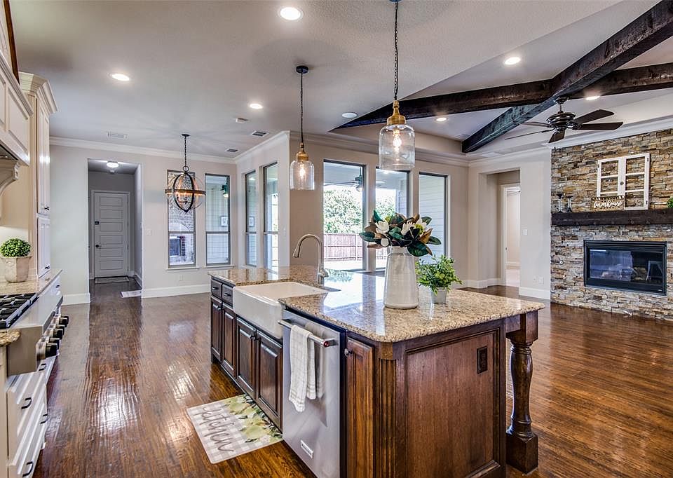 Beautiful Drees Home in the Canals at Grand Park. Trending farmhouse style with wrap around front porch and open floor plan make this home perfect for easy family living and entertaining. Kitchen boasts a large center island with countertop seating, gas cooktop and stainless appliances. Study, dining, master plus one bedroom down. Gorgeous hardwood floors, beamed ceilings and plantation shutters. Upstairs media, game room and two bedrooms. Inviting outdoor living area with pool-size yard, extended patio and fireplace make this home casual & welcoming. Three car garage, central vac. Community pool, clubhouse & gym. Exceptional location close to shopping, entertainment & easy access to major highways.