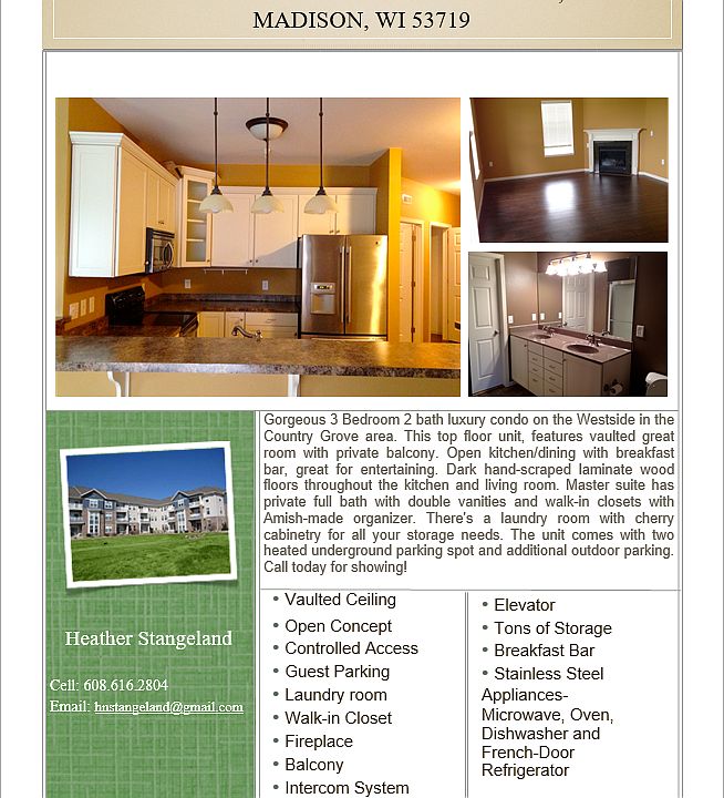 Gorgeous 3 Bedroom 2 bath luxury condo on the west side in the Country Grove area. This top floor unit, features vaulted great room with private balcony. Open kitchen/dining with breakfast bar are great for entertaining. Dark hand-scraped floors throughout the kitchen and living room. Master suite has private full bath with double vanities and walk-in closets with Amish-made organizer. There's also a laundry room with cherry cabinetry for all your storage needs. The unit comes with a heated underground spot with additional outdoor parking. If this posting is still up, then its still available. Please text, call or email if your interested. Heather Stangeland Hstangeland@hotmail.com 608.616.2804 Rental features: Vaulted Ceiling Open Concept Controlled Access Guest Parking Laundry room Walk-in Closet Cable Ready Balcony Intercom System Elevator Ceiling Fans Breakfast Bar Stainless Steel Appliances -- Microwave, Oven, Dishwasher and French-Door Refrigerator Central Air Tons of Storage Fireplace Hand-scraped Floors