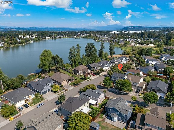 Lake access just steps away! Live the dream of being able to walk to a life on the water. This spacious home with a peek a boo view of the water sits on a large corner lot with a fully fenced backyard. Enjoy the newer patio and hot tub in this quiet and safe neighborhood. Large main level living room with a bay window and gas fireplace. Newly refreshed kitchen/dining room combo with new floors and reimagined cabinets. Main level bonus room with French doors and laundry area adds to the space and convenience. The primary suite upstairs offers the view of the water, with a huge ensuite bathroom with separate bath and shower space, double sinks, and a walk in closet. A 2nd full bathroom separates the other 2 bedrooms upstairs. Recently replaced roof and gutters brings peace of mind, and this is a very well maintained neighborhood with access to many trails, parks, food cart pods, etc! Come enjoy this oasis built around 2 uncrowded lakes, with easy access to the Gorge, Mount Hood, and other PNW wonders.