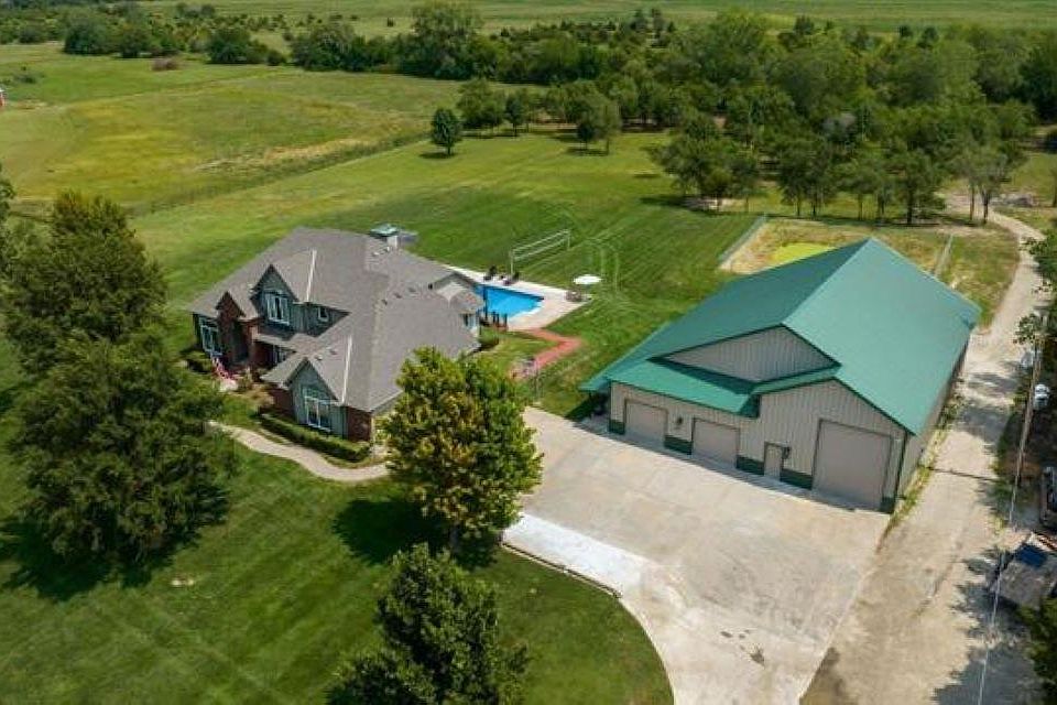 Don't miss out on this stunning move-in ready 1 1/2 story home located on approximately 10 acres - just south of Goddard and close to schools. This home has 7 bedrooms and 5 bathrooms. All of the rooms are spacious! As you enter, you have a true foyer and large staircase leading to the upper level. Living room with large windows for lots of natural lighting looking out over gorgeous pool and trees galore. The master suite and private master bath are on main floor. Master bath with separate tub/shower and double vanities does open to deck. There is a 2nd bedroom and 2nd full bath on main level, too. Lots of family and friends can fit into this formal dining room at the holidays! Kitchen with granite countertops, cherrywood cabinetry and SS appliances opens to roomy hearth room with gas fireplace for that cozy feel. And right off the hearth room is the deck for grilling and entertaining and, of course, relaxing! Upstairs features 3 more bedrooms with Jack N Jill bathroom as well as a second bathroom. Basement boasts huge family and wet bar. Two more bedrooms and large bathroom complete this level. Walk out of this basement to the welcoming 20 x 40 inground pool with diving board - 9 1/2 feet at the deep end! Also located on this property is a 54 x 64 outbuilding which offers so much more! One of the exciting features in this building is the large (40 x 30) studio/guest quarters complete with kitchen and bathroom. There are 2 garage doors on the wood shop area (30 x 24) which is heated, too. In addition, the 24 x 64 auto shop has a 14 foot garage door in the front (perfect for RV parking) and an 8 foot garage door in the rear. Notice the 2-post lift does stay! The seller has just recently added concrete drive and wrought iron fencing with electric gate. Geo-thermal HVAC systems in house and outbuilding, too. Propane heat is for fireplace and heating the auto shop and the wood shop. The front 4 acres is fenced, which leave 6 acres in the back. This home certainly shows pride of ownership with so many extra features (camera system, security system, geo-thermal system) which seller will gladly show to the new buyers! All this and only 15 minutes from west Wichita! Schedule a time to come see this beautiful country home today!