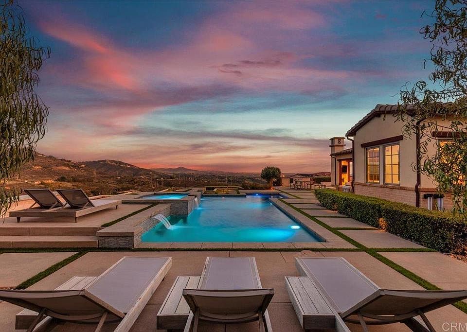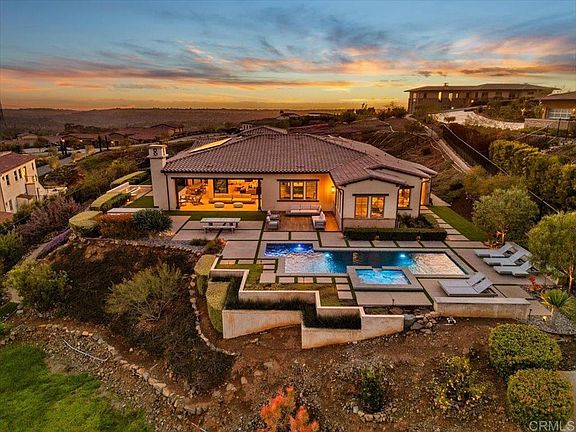 RARE SINGLE STORY IN OLIVENHAIN’S PRESTIGIOUS ONE OAK!! Pure luxury set on an elevated 1.11- acre view lot, this stunning highly upgraded single-level home offers breathtaking panoramic mountain vistas, ocean views and sunsets. A private long driveway leads to the gated grand courtyard entry with fireplace and seating. The light & bright open floor plan offers; 4 car garage, 10 foot ceilings, large dining room/bar equipped with dual wine fridges, chefs kitchen with top of the line Thermador appliances and dual dishwashers, luxurious stone and marble counters and backsplash, spacious butler pantry with refrigeration, storage cabinets, a sink and large pantry. The oversized island has seating for 8, opening up to a grand great room and additional dining room with oversized multi stacking glass doors that capture the sweeping views all around and seamlessly blends the indoor outdoor living. Outside in the resort style yard you will find a large wrap around lanai with plenty of space for entertaining/living, TV/fireplace wall, and alfresco dining. A modern salt water pool & spa with waterfalls, built in BBQ island with bar seating, large fire pit with banquet seating and steps that lead down to a tranquil yoga grass area. This very special home seamlessly merges modern sophistication with the surrounding natural beauty. Retreat to the generously sized luxurious primary suite, where stunning mountain views surround, the spa-inspired primary bath offers dual vanities, a soaking tub, a walk-in shower, a private outdoor shower and an oversized walk-in closet with custom cabinetry. Down the hall you will find a guest suite that features sliding glass doors that open to a covered lanai, offering a peaceful retreat for visiting guests. A versatile bonus room, perfect for an office or a 5th bedroom, and an additional two other great sized bedrooms with en suite baths, generous sized laundry room with loads of cabinets for storage. A fully outfitted garage gym, owned solar, located in a top rated school district. This home really has it all!