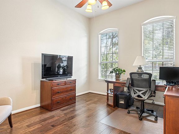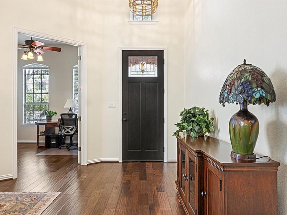 Welcome home to this stunning one story greenbelt home that perfectly blends comfort, elegance, and privacy. From the moment you step inside, you’ll be greeted with high ceilings, beautiful wood floors and an open, inviting layout filled with natural light. The thoughtfully designed floor plan features a home office at the front, two spacious secondary bedrooms with a full bath off the hallway and a luxurious primary suite located at the back of the home. The heart of the home is the gourmet kitchen, showcasing new countertops and backsplash, a large center island, and seamless flow into the family room complete with a corner fireplace. Step outside to your own private oasis which boasts an extended patio overlooking a lush greenbelt lined with native Texas trees. There is a remote controlled sun shade on the patio for some added privacy. Additional highlights include a 3-car tandem garage with overhead storage and water softener. This home comes with RO system, HVAC was replaced in 2024, water heater and pressure reducing valve replaced 10/2025. Conveniently located between I-35 and 183A, you’ll enjoy quick access to top-rated shopping, dining, and entertainment. Experience peaceful greenbelt living with all the modern comforts!