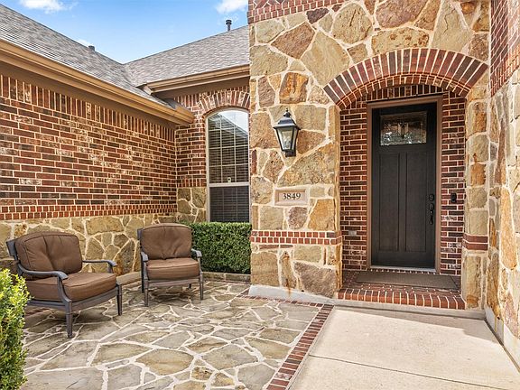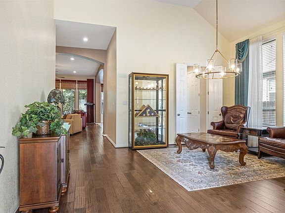 Corner fireplaceHigh ceilingsExtended patioBeautiful wood floorsLarge center islandNew countertops and backsplashGourmet kitchen