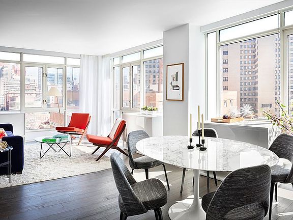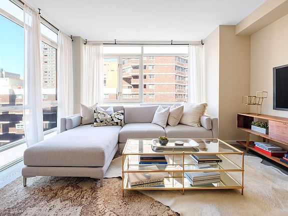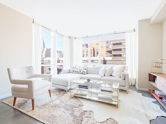 CODA - 385 First Ave is pleased to welcome you back and is now available for private in-person appointments with new health and safety standards. Please contact us for a virtual first appointment and in-person follow up appointments. IMMEDIATE OCCUPANCY This perfectly proportioned split two-bedroom, two-bathroom residence offers 1,190 square feet of generous space. The sun-filled corner living room offers northwest exposures. The master bedroom suite boasts an enormous walk-in closet, and master bathroom includes honed Bardiglio marble flooring, gloss lacquer vanity with honed Bardiglio marble countertop, polished Olympic marble walls, and Waterworks fixtures. Kitchen features honed Petite Granite countertops and backsplash, custom glossy white lacquer cabinetry, Sub-Zero refrigerator, Bosch cooktop, oven, and dishwasher. Additional features offer 5" wide oak flooring, GE washers and vented dryers, and through-wall HVAC units in white lacquer custom cabinetry. Amenities and services include a 24-hour attended lobby, live-in Resident Manager, private fitness room programmed by The Wright Fit, resident's lounge and landscaped terrace with grill, fully furnished and landscaped roof deck, and private storage.