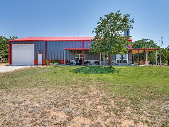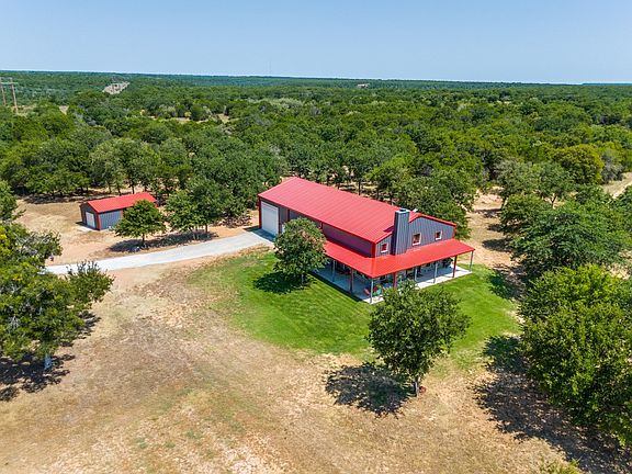 Enjoy over 12 acres of peaceful country living just west of Fort Worth. This thoughtfully designed home offers two bedrooms, two bath, plus a spacious loft that could be converted to a third bedroom, home office, or flex space. Open-concept living blends modern comfort with rustic charm and features fully foam-insulated construction for excellent energy efficiency. A wide front porch provides the perfect place to relax and take in expansive views and quiet sunsets. The chef’s kitchen includes a farmhouse sink, quartz countertops, oversized island, walk-in pantry, and custom shaker-style cabinetry. The primary suite features a spa-inspired bath with freestanding soaking tub, oversized walk-in shower, double vanity, and generous walk-in closet. Abundant storage is found throughout the home, along with a versatile loft offering additional living space. An oversized double-door garage includes 220-volt outlets suitable for RV or equipment hookup. Located just 2 miles from the Lake Palo Pinto boat dock, offering convenient access to fishing, boating, and weekend recreation.