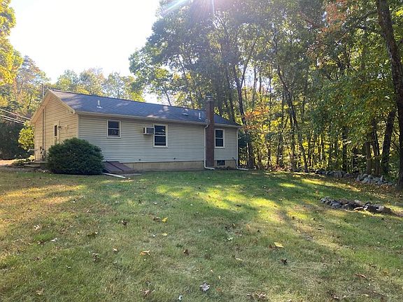 Single level living on this 1.5+ acre lot on a country road with large private yard. Hardwood floors in spacious LR & BR's. Two BR's have ceiling fans & walk-in closets, Galley kitchen with spacious eating area overlooking secluded country lot with a storage shed and stone walls. Newer roof/windows. Laundry h.u. in basement with plenty of extra storage and large finished room with recess lighting & decorative stone hearth/mantle. Wood stove decorative only. Move right in and enjoy country living!