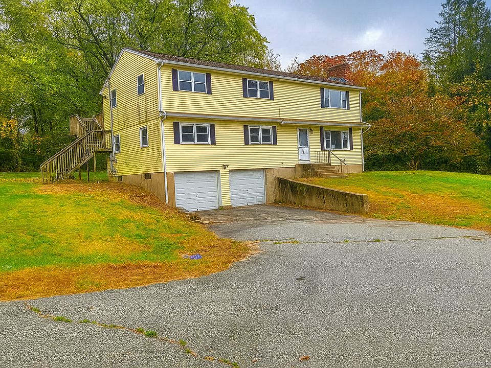 Set on a private 25-acre lot, this spacious Colonial-style home offers the perfect blend of flexibility, comfort, and convenience. The main level features a bright living room with a fireplace, hardwood floors, a large kitchen, 3 bedrooms, and 2 full bathrooms, including a primary suite with its own bath. The attached in-law unit provides an ideal setup for extended family or guests, offering its own kitchen, living room, dining area, 2 bedrooms, and a full bath - creating five total bedrooms and three full bathrooms throughout the home. Each unit enjoys its own deck overlooking the peaceful, wooded surroundings, as well as separate laundry areas for added convenience. Additional features include updated thermal replacement windows, low-maintenance vinyl siding, and a two-car attached garage. Located close to highways yet tucked away for privacy, this property is a rare find for those seeking space, versatility, and multi-generational living in a serene setting. Ideal for some type of renovation loan.