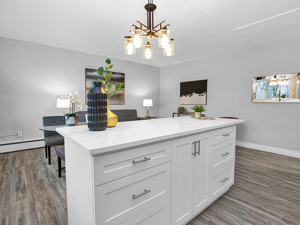 Wide plank flooringBig windowsOpen concept living spaceBeautiful white kitchenStainless steel appliancesKitchen islandStylish fixtures