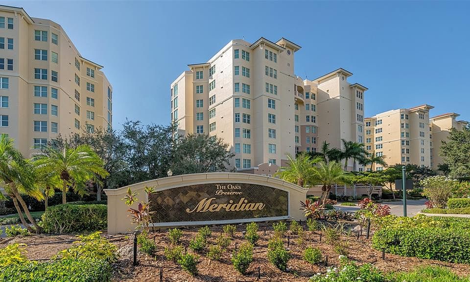 One or more photo(s) has been virtually staged. From the moment the private elevator doors open, the panorama of the view has you at ‘hello,” with a northwest-facing expanse over the preserve, the lagoon below, Sarasota Bay and the Gulf beyond. This orientation brings cooler interiors, dramatic natural light and unforgettable sunsets. Rare 10’ ceilings amplify the spaciousness and invite the light to flow freely throughout this 2,778-sq.-ft. penthouse. The residence features tile flooring and walls of sliders leading to a large screened terrace perfect for relaxing or entertaining. The kitchen is both spacious and stylish, featuring stone countertops and harmonizing backsplash, stainless-steel appliances, and wood-toned cabinetry with glass details. Both an adjacent breakfast area and a formal dining space offer flexibility for everyday living or entertaining. The spacious primary suite is a tranquil retreat with its own terrace access, sitting/desk area, and spa-style bath with dual vanities, makeup counter, soaking tub and walk-in shower. Two guest bedrooms plus a dedicated office or den provide space for everyone. A standout among its peers, this residence includes a private 2-car garage and its own driveway – a rare and valuable amenity that provides easy front access and convenient guest parking just outside your door. The Oaks is a nationally recognized, 24-hour guarded country club community offering an unmatched lifestyle. Amenities include two 18-hole championship golf courses, an award-winning racquets program with 12 Har-Tru Hydro-Grid tennis courts, 4 pickleball courts, a croquet lawn, state-of-the-art fitness center, junior Olympic heated pool, bocce, basketball, playground and more. Meridian residents enjoy access to their own private amenity center featuring a heated pool & spa, fitness facility and outdoor grilling area. Membership is required, with no waitlist for golf or social membership.