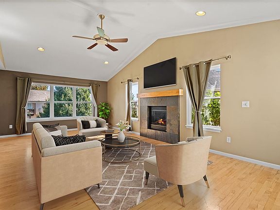 Welcome home to this beautiful property full of thoughtful details in a sought-after neighborhood! The main level features an open floor plan with vaulted ceilings, a great stunning room with a custom gas fireplace and slate surround, and a spacious kitchen complete with Maple cabinetry, upgraded granite countertops, stainless steel appliances, and Maple hardwood floors throughout. Upstairs, the vaulted primary suite is a true retreat, offering a barn door entry to a private bath with a dual-sink, adult-height vanity. Plus, an oversized walk-in closet. Two additional freshly painted bedrooms and a full bathroom complete the upper level, providing comfort and convenience for family or guests. The finished lower level adds even more living space with a large rec room, small built-in bookcase, plus a built-in refrigerator, and fourth bedroom or office, full bath, and daylight windows that fill the space with natural light. Outdoor living is just as inviting with a maintenance-free Trex deck, oversized patio, and fenced yard—perfect for relaxing or entertaining. Additional features include an extra parking pad, ample garage storage, stainless steel appliances, Nest thermostat, and a home that has been professionally cleaned. This home truly offers the perfect balance of style, comfort, and functionality.