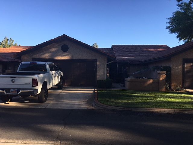 Wow! Beautiful remodeled home in 2016! New Flooring, Paint, Fireplace, Light Fixtures, Mirrors, Knobs, Toilets and more! Race Deck flooring in garage with custom built cabinets and storage racks. This is the only unit with covered back patio AND an enclosed back yard! Great for privacy and small pets! Across the street from pool, spa and tennis courts! This home will go fast!