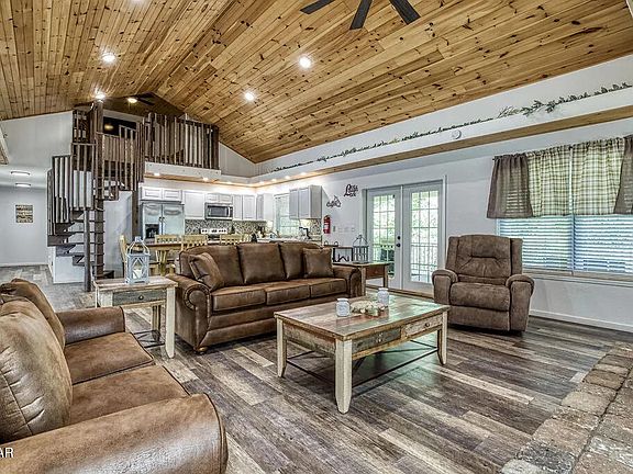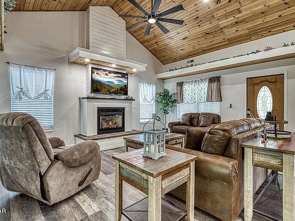 Beautifully remodeled 3 bedroom, 3 bathroom home in the Smoky Mountains with two additional bonus rooms, offering plenty of space for family, friends, or guests. The open, airy floor plan is perfect for gathering—enjoy evenings by the fireplace, cook in the well-equipped kitchen, or retreat to one of the comfortable bedrooms for rest and relaxation. A spiral staircase leads to a cozy loft area with a TV, air hockey, and a futon—perfect for kids or extra guests. Outdoor living shines with a full-length covered patio featuring ample seating and a grill for all-weather enjoyment, along with a private hot tub on the lower patio. With its modern updates, generous layout, and inviting design, this property is ideal as a permanent residence, second home, or short-term rental investment with excellent income potential.