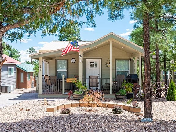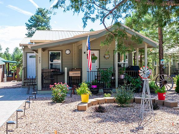 All electric furnished home ready to move in to. This park model is 2 bedroom and 2 bathroom cottage model with upgraded stainless steel appliances, a living room addition, eat-in kitchen with table and chairs, Corian kitchen countertops with barstools, side back door off master bedroom, 4 ceiling fans, on-demand tankless electric hot water heater, stainless steel farmhouse kitchen sink, pull out pantry drawers for easy access, electric fireplace, flat screen TV, oversize closets, granite master bathroom vanity, walk-in master bath shower with grab bars, hall bath shower with grab bars, roof gutters with leaf guards, exterior EV electric outlet, insulated shed with electric and shelving, sprinkler system, potted flowers including roses, paver walkway and driveway, solar pathway lights, wireless door bell, Ring exterior security camera, one step entry, large covered porch with gate, large landscaped lot. This home is located in the most highly sought after 55+ community in Show Low. The site is a comprehensive lease. Annual site fee covers the homesite as well as water, sewer, trash service & basic internet. This saves on the cost of real estate taxes, HOA fees and year-round utility costs. The community is a 55+ Park Model community located in the tall pines of Show Low, Arizona. As a year-round community you can enjoy all four seasons of the White Mountains, imagine yourself enjoying the cool mountain air, shaded by the tall pines and watching the deer stroll through the forest, all while only one mile from major shopping, dining and state of the art medical facilities. An array of outdoor activities can be found nearby too. The community's Rules & Regulations prohibit the use of the home as a rental.